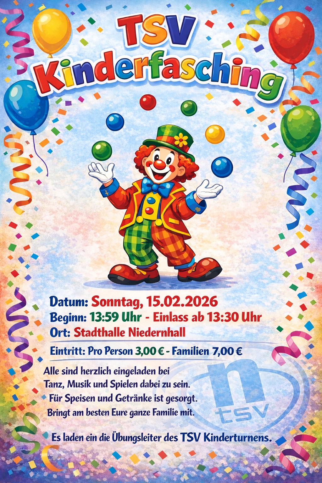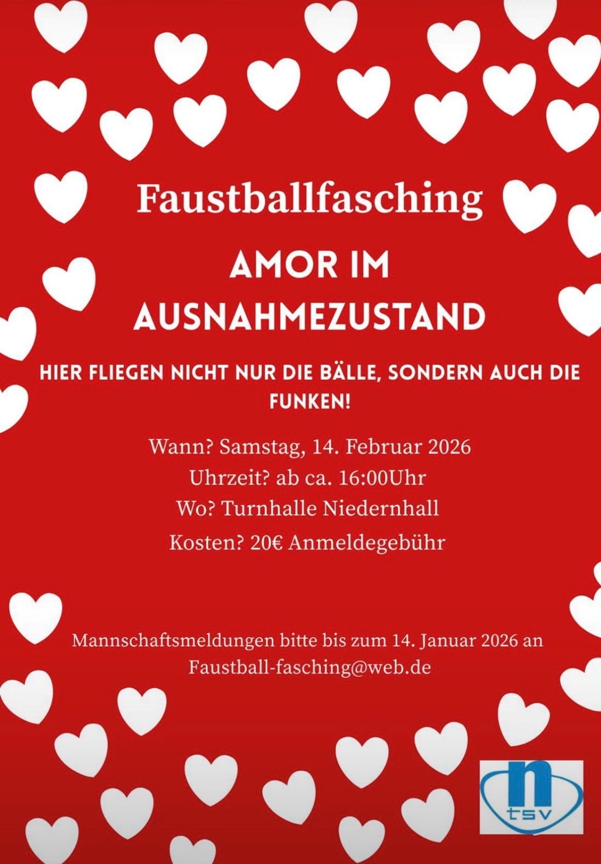 Am Samstag den 14.02.2026 (Valentinstag) findet der traditionelle Faustballer Fasching des TSV Niedernhall in der Sporthalle im Brückenwiesenweg statt.