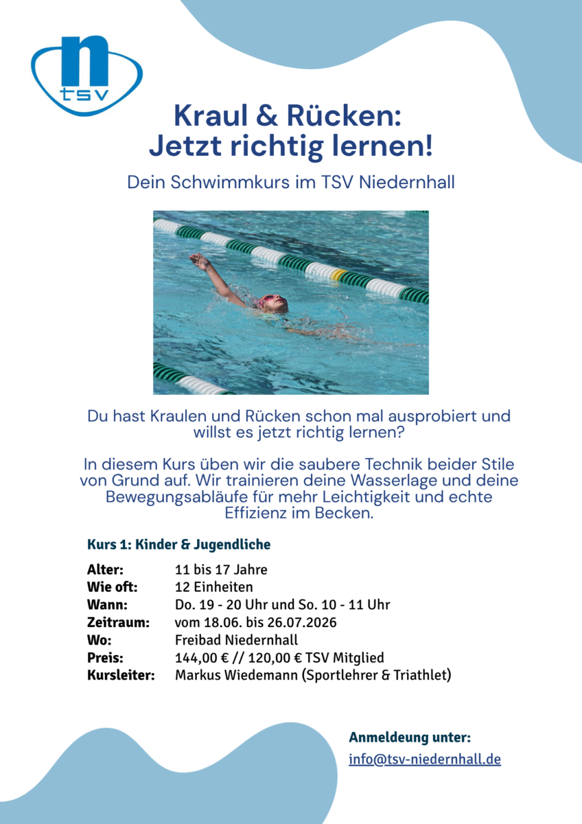 Zeige grösseres Bild Neu im TSV : Schwimmkurse für Kinder und Erwachsene TSV NH GZ2026-04-18T09:56:58+02:00 Teilen Sie diesen Artikel! FacebookXRedditLinkedInTumblrPinterestVkE-Mail Ähnliche Beiträge Am Montag, den 20. April 2026 ist das Geschäftszimmer nicht besetzt. 18. April 2026 Einladung Jahreshauptversammlung 2026 25. März 2026 Kurs Rücken fit 4. März 2026 Kurs Fitness Mix 4. März 2026 Neue Öffnungszeiten ab November 29. September 2025